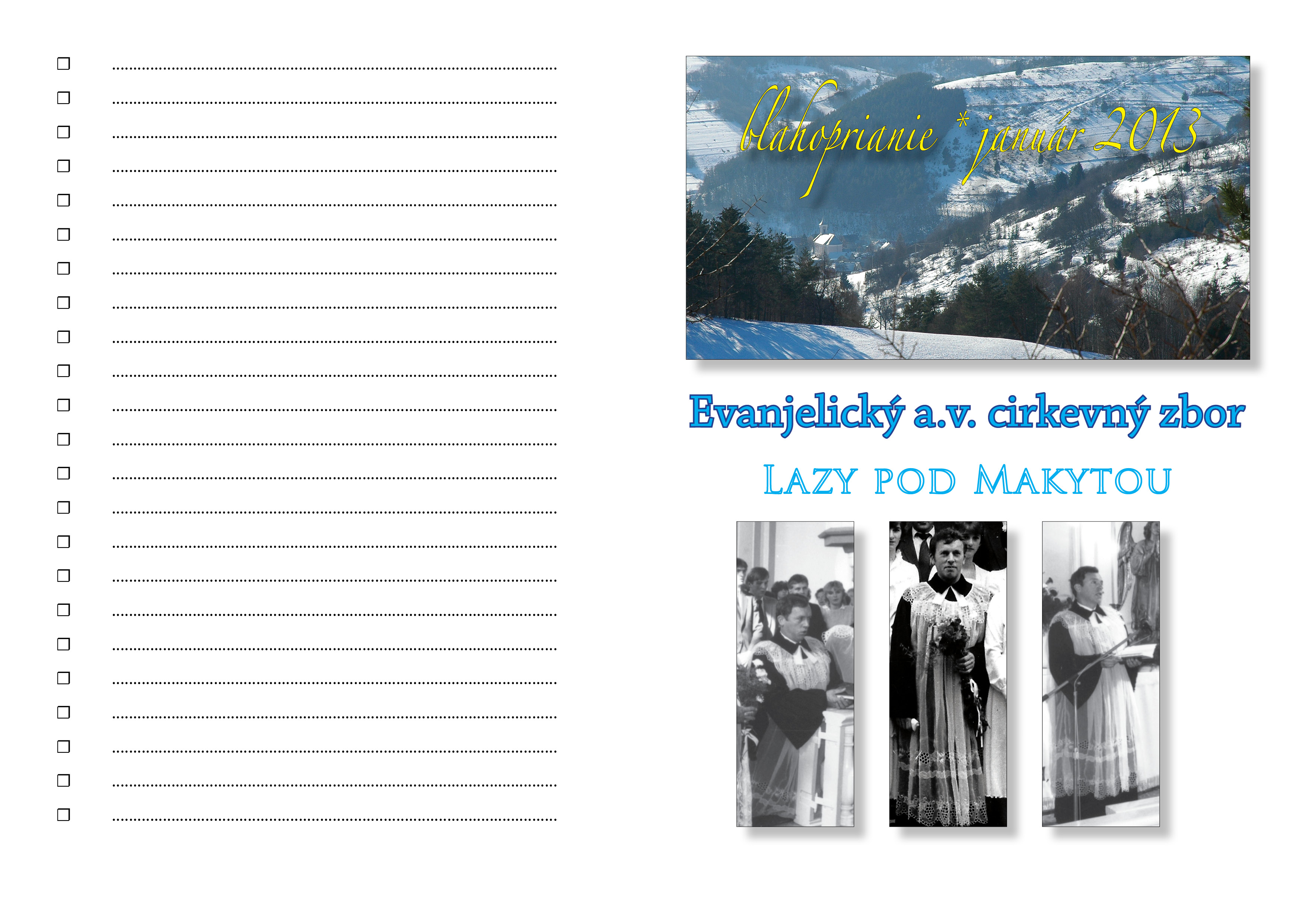 Vnútromisijný výbor nášho cirkevného zboru v Lazoch pod Makytou by chcel vytvoriť podmienky pre podpornú skupinku pre pozostalých a smútiacich, kde by ste mali možnosť stretnúť sa aj s inými členmi nášho zboru, ktorí tiež prežívajú žiaľ pri strate blízkeho človeka. Daniela Pelikánová, facilitátorka Oznam najmä pre členov rím.kat. farnosti v Lazoch pod Makytou S blížiacim sa rokom 2013 si Vás dovoľujeme osloviť s ponukou diaľničných známok. Naša diecéza má možnosť zabezpečiť distribúciu a predaj diaľničných nálepiek na rok 2013. Jedná sa o možnosť zabezpečiť diaľničné nálepky pre všetkých záujemcov z radov veriacich a širšej verejnosti v rámci jednotlivých farských spoločenstiev. V tomto prípade by už zámer nebol, aby si všetci záujemcovia kúpili lacnejšie nálepky, ale o to, aby kúpou nálepky v plnej cene, t.j. 50,- Eur, podporili farnosť 1,- Eurom. Dňa 25. novembra 2012 usnula v Pánu vo veku 91 rokov naša spolusestra vo viere Zuzana Ciesarová, r. Labajová z Panštiny. V tejto časnosti sme sa s ňou rozlúčili v stredu, 28. novembra. Vo veku 60 rokov usnul náš spolubrat vo viere a brat i príbuzný Ľubomír Knieža z Panštiny. |
