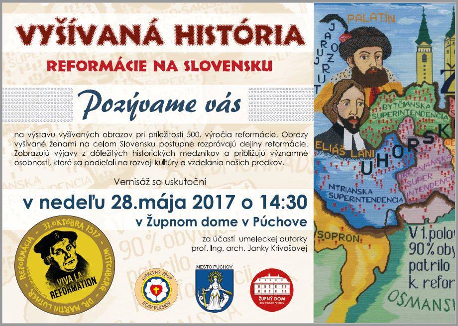 V nedeľu, dňa 28. mája 2017 o 14.30 hod. sa uskutoční v Župnom dome v Púchove výstava „Vyšívaná história reformácie na Slovensku 1517 – 2017“.