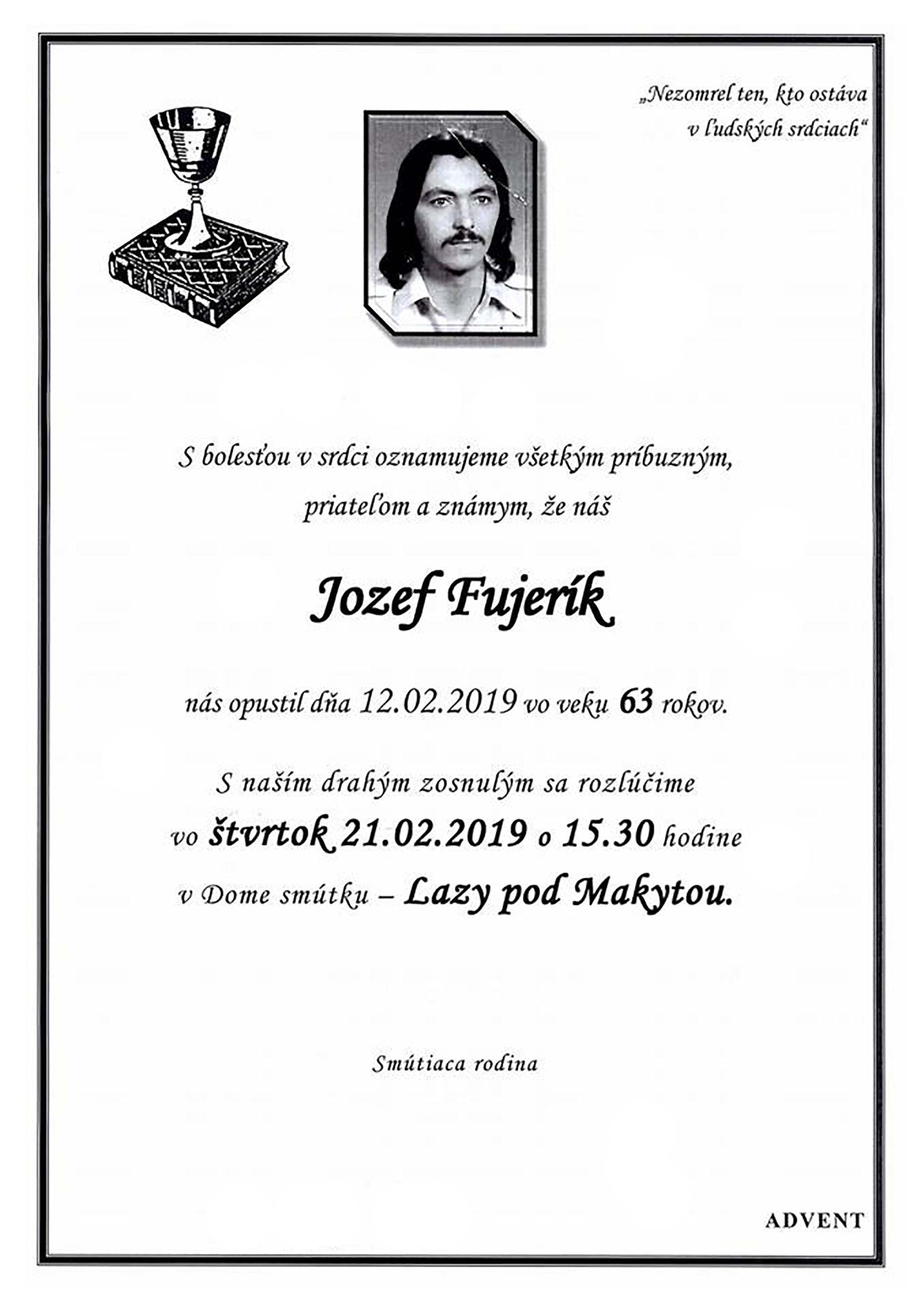 So zármutkom, ale v kresťanskej nádeji oznamujeme, že vo veku 63 rokov usnul náš spolubrat vo viere a pre rodinu príbuzný Jozef Fujerík.