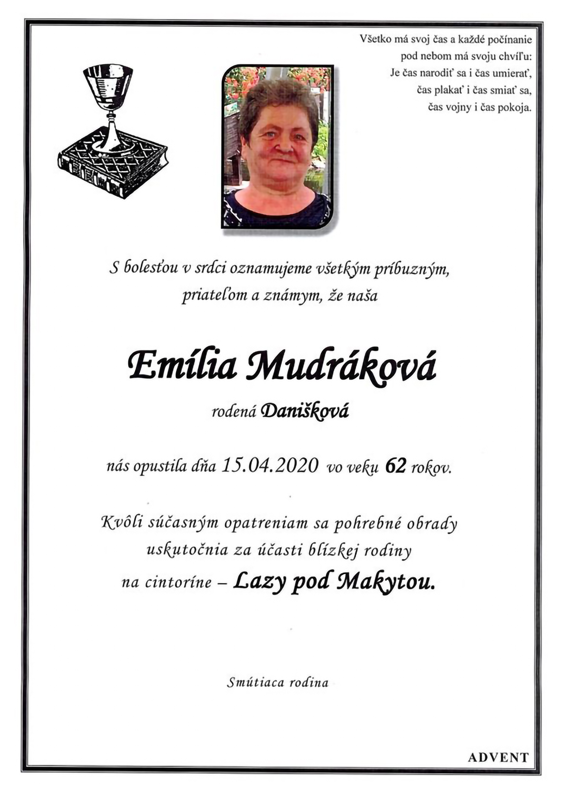 So zármutkom, ale v kresťanskej nádeji oznamujeme, že vo veku 62 rokov usnula v Pánu naša spolusestra vo viere a pre rodinu matka, sestra a príbuzná Emília Mudráková, r. Danišková.Z dôvodu aktuálnej spoločenskej situácie sa evanjelická pohrebná počestnosť uskutoční iba v úzkom rodinnom kruhu na cintoríne v Lazoch pod Makytou.