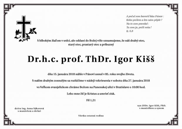 Igor Kišš parteSo zármutkom, ale v nádeji vzkriesenia oznamujeme, že v Pánu usnul vo veku 85 rokov otec, starý a prastarý otec Dr. h. c. prof. ThDr. Igor Kišš, evanjelický a. v. farár, teológ a bývalý dekan Evanjelickej bohosloveckej fakulty UK v Bratislave.