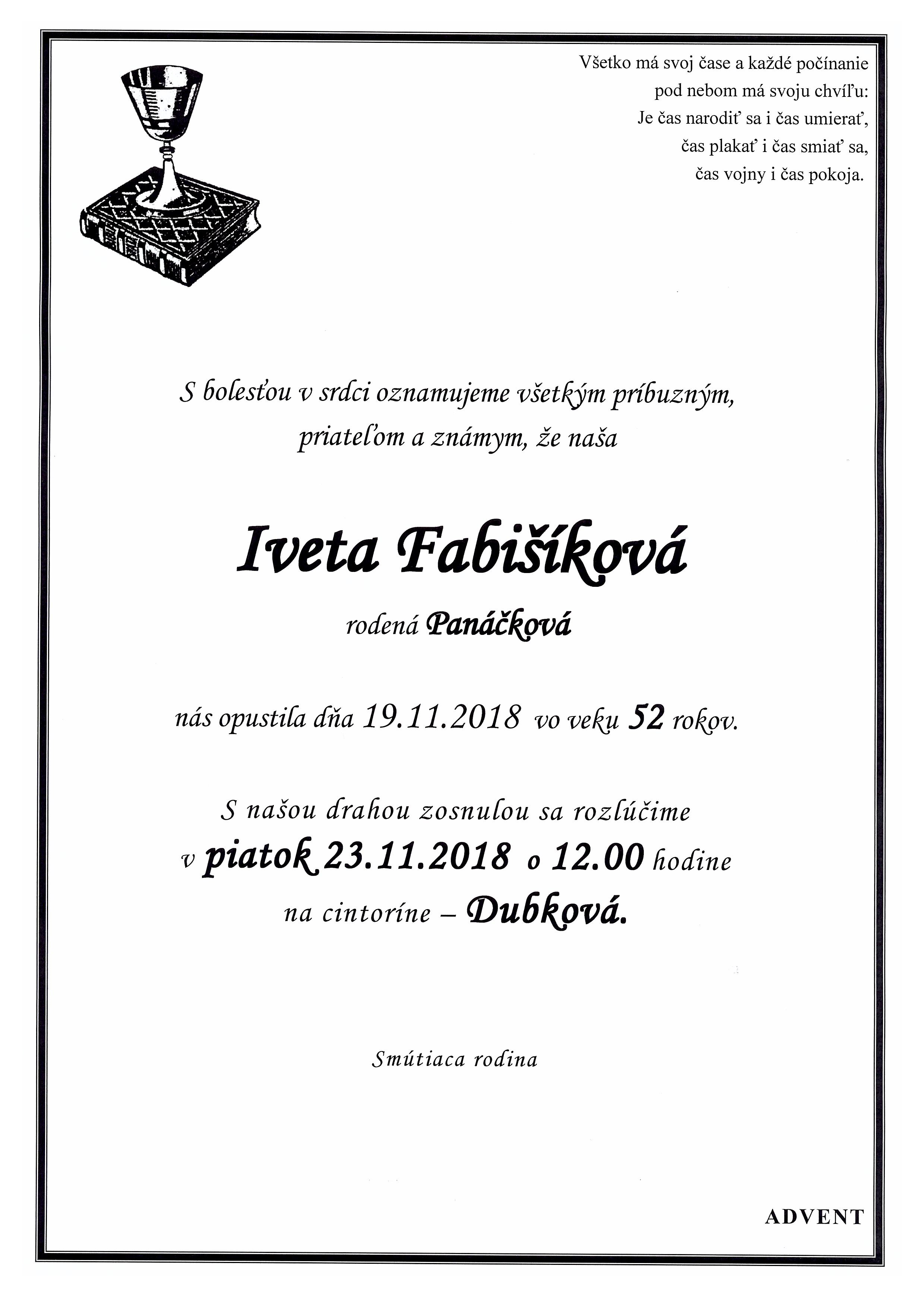 Fabišíková parteSo zármutkom oznamujeme, že dňa 19. novembra 2018 usnula vo veku 52 rokov naša spolusestra vo viere a pre rodinu príbuzná Iveta Fabišíková, rod. Panáčková z Dubkovej.