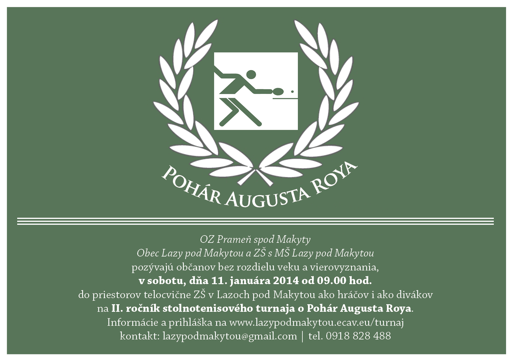 roy_plagat_2014 miniV sobotu, dňa 11. januára 2014  sa konal v priestoroch telocvične ZŠ s MŠ Lazy pod Makytou II. ročník pingpongového turnaja o Pohár Augusta Roya.